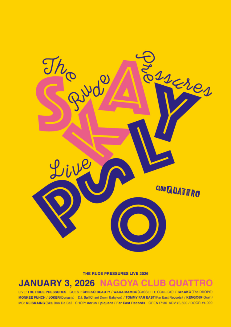 Live: THE RUDE PRESSURES Guest: CHIEKO BEAUTY / WADA MAMBO(CaSSETTE CON-LOS) TAKAKO(The DROPS) / MONKEE PUNCH / JOKER(Dynasty) DJ: Sal(Chant Down Babylon) / TOMMY FAR EAST(Far East Records) / KENGO69(Grain)MC:KEISKAING(SKA BOO DA BA) Shop: oorun / piquant / Far East Records