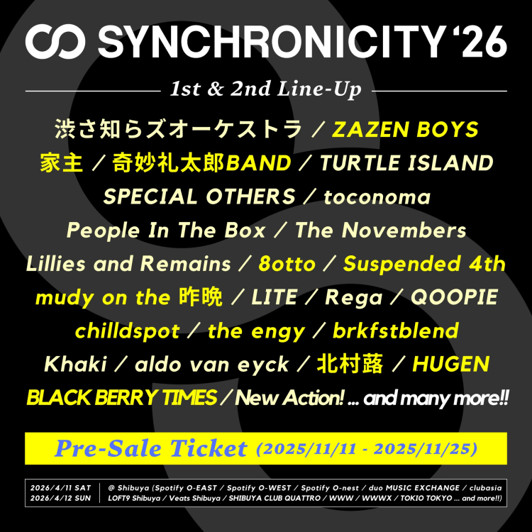 渋さ知らズオーケストラ / ZAZEN BOYS / 家主 / 奇妙礼太郎BAND / TURTLE ISLAND / SPECIAL OTHERS / toconoma / People In The Box / The Novembers / Lillies and Remains / 8otto / Suspended 4th / mudy on the 昨晩 / LITE / Rega / QOOPIE / chilldspot / the engy / brkfstblend / Khaki / aldo van eyck / 北村蕗 / HUGEN / BLACK BERRY TIMES / New Action! ... and more!!